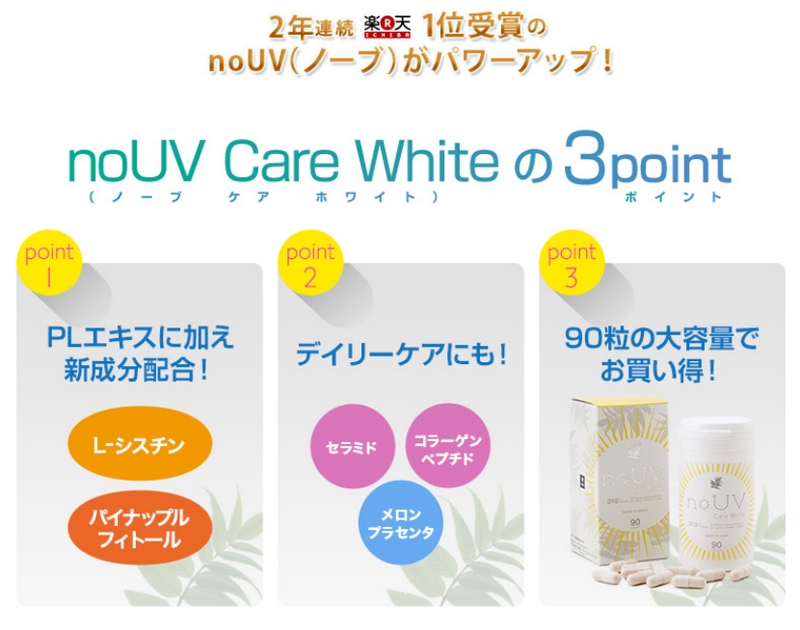 noUV Care White (ノーブケアホワイト)14種類の美容成分+PLエキス配合!   定期便なら【お得な30%OFF!送料無料】です。
